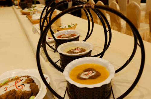 最逼真最不走寻常路的,是南京店大厨们做出来的《戏剧猴头菇脸谱》,菜肴正中间用红椒等做出了大圣的模样,主料用的猴头菇和鱼蓉。