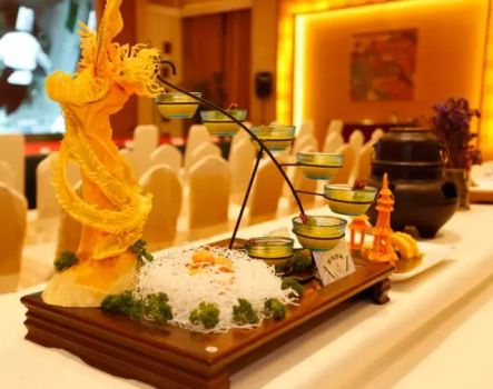对于小女生来说,小清新的样式的菜肴可能更招人喜欢。胥城大厦这道装盘成荷塘月色样式的《秋意蟹鲢》,也是格外的吸引眼球。小碗中盛放了鲢鱼和芋头,外侧有半只小螃蟹,扎起的小荷包梨装着各种水果丁,旁边点缀着藕片。让人一秒回到夏天。