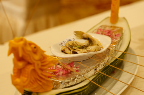 月亮湾店的大厨将树山的梨做成一个器皿,里面盛放着富硒米粉做成的佳肴,在装饰的部分,还有一本写了字的用豆皮做成的小书,不经想说,大厨很有想法。