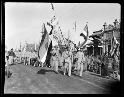 1918年11月,北京警校学生为庆祝一战胜利游行。民国初年朱启钤对北京市政进行过一次大改造,当时一些路面铺设了沥青。