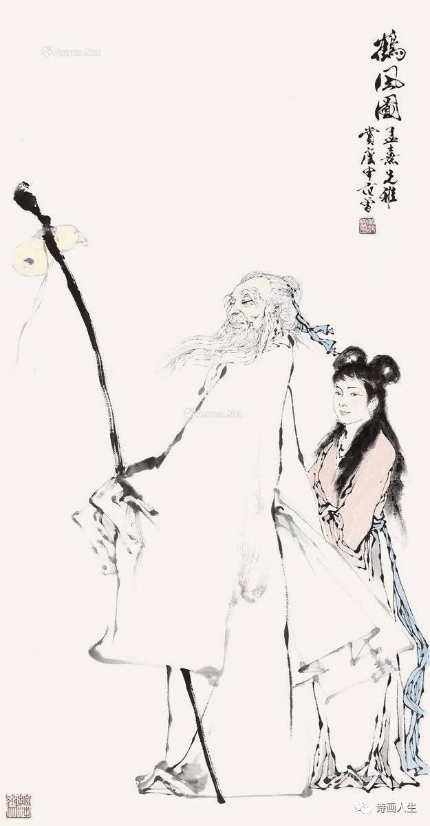范曾的人物画饱含着丰富的文化内涵和特有的气质。欣赏她的画,即沉思每幅作品中意境与诗意,又惊叹其人物线条的穿透力。力透纸背,入木三分的功夫,所承载的是他儒雅古拙的人文精神和传统文化的思考。作品中栩栩如生的造型,折射着艺术家雍容豁达,和蔼可亲的个性。