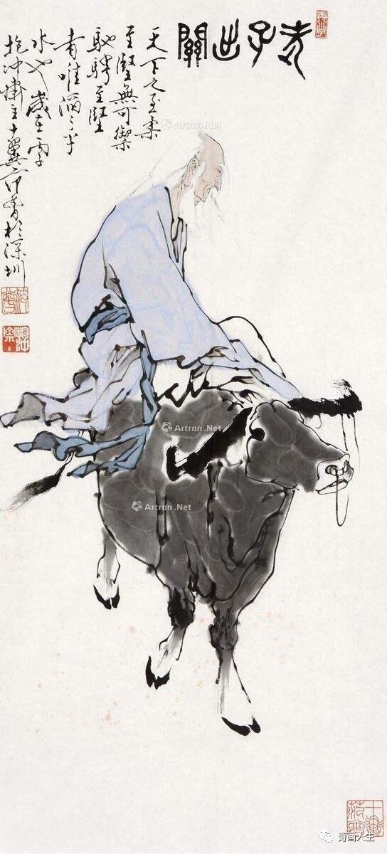 阅读范曾的写意人物,笔才一二,象以应焉。观南宋梁楷人物《泼墨仙人图》,该图以高度概括的简练手法,用蘸墨大笔,寥寥几笔,如墨泼纸,信笔而成,描绘出一个醉醺醺的神仙形象来。此画极为生动,神气十足,达到了水墨画的极致。而当你阅读范曾的作品,同样惊诧他高超的技法。先生善于化繁为简,寥寥几笔,就把作品中人物形象挥洒的淋漓尽致。你也从中体验水墨尊者的率性真情。如他的老子出关图,寥寥几笔,通过极其流畅的线墨,便将老子出关时仙风道骨的形象,展示的淋漓尽致。一笔一墨一仙翁,留给阅读者叹为观止的浩叹。