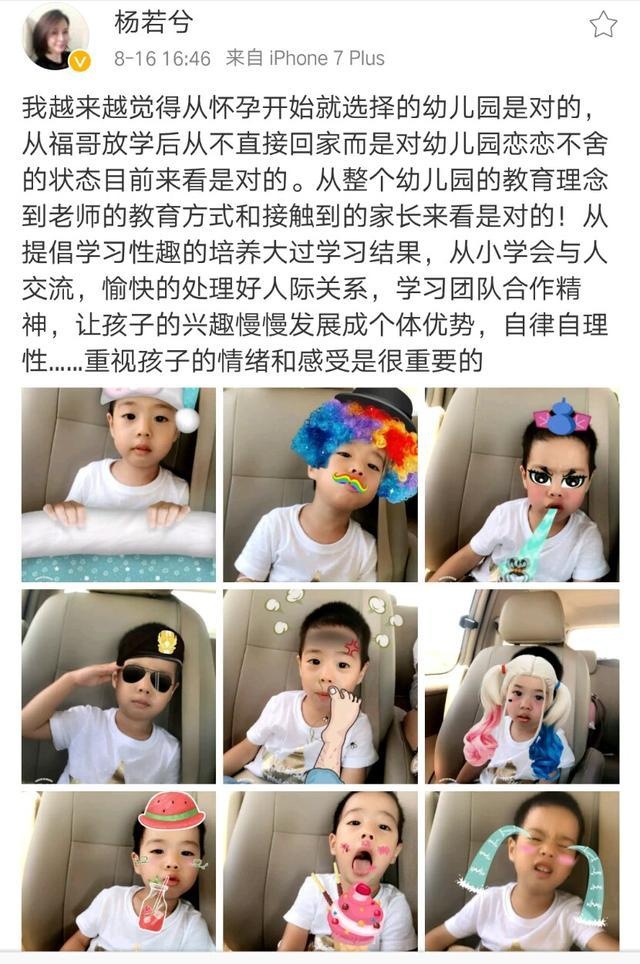 8月16日下午,城会玩的杨若兮晒出了儿子的九宫格,并且说了一段图文并不相关的文字。大致意思就是感慨选择好的幼儿园的重要性,幼儿园提倡学习兴趣的培养大过学习结果,从小学会与人交流,愉快地处理好人际关系,学习团队合作精神,让孩子的兴趣慢慢发展成为个体优势,自律自立,重视孩子的情绪和感受很重要!