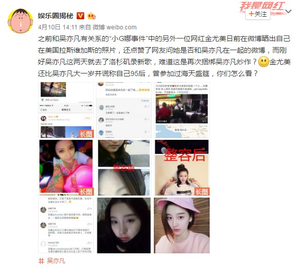 新浪娱乐讯 日前,网曝网红金尤美插足别人家庭当小三,男方原配已经有两个小孩了,男的在原配出国旅行期间以出差为由带着她去丽江玩,两人还公然在微博上秀恩爱。金尤美还与吴亦凡有过一段绯闻。