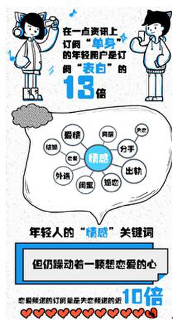 离家在外的年轻人被七大姑八大姨催婚已成最典型话题。从一点资讯发布的2016年国民情感图谱可见,在一点资讯上订阅"单身"的年轻用户是订阅"表白"的13倍。对年轻人来说,单身是种新常态。同时,年轻人的情感关键词包括爱情、出轨、闺蜜、外遇、结婚、分手等,内涵丰富、精彩纷呈。尽管如此,恋爱频道的订阅仍然是失恋频道的近10倍,年轻人单身常态下渴望恋爱的心态展露无遗。