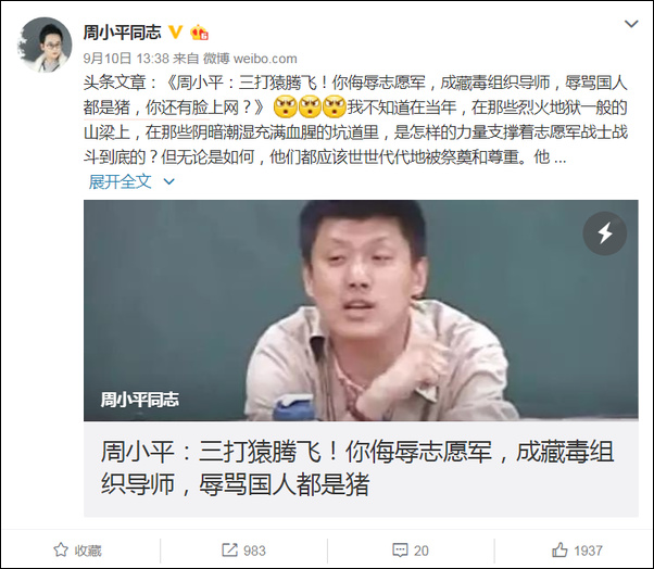 9月10日晚,微博大V@周小平同志 发布了头条文章《周小平:三打猿腾飞!你侮辱志愿军,成藏毒组织导师,辱骂国人都是猪,你还有脸上网?》,批评袁腾飞侮辱志愿军,并就袁腾飞针对西藏等问题发表的看法提出批判。