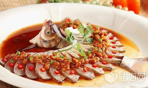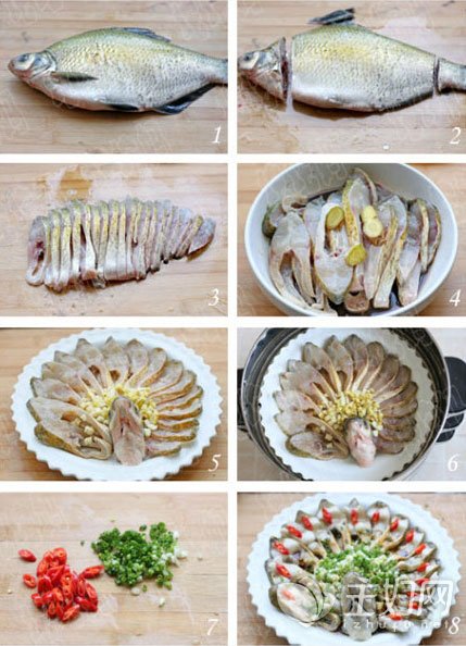 3中段用刀切成片(可切断也可不切断,不切断的刀法注意是从背上切开,鱼肚的部分相连,个人认为切断更好造型也更便于腌渍);5将鱼尾弃之不用,鱼头朝上摆在盘中,鱼片在盘中摆成扇形,做成孔雀开屏的造型,再在表面撒上姜蒜末...
