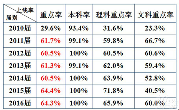 截止目前:共毕业八届学生,已取得连续七届高考重点上线率超过60%的优异成绩,其中:2011届为61.74%,2012届为60.52%,2013届为61.3%,2014届为60.5%,2015届为64.4%、2016届为64.3%、2017届为82.3%。