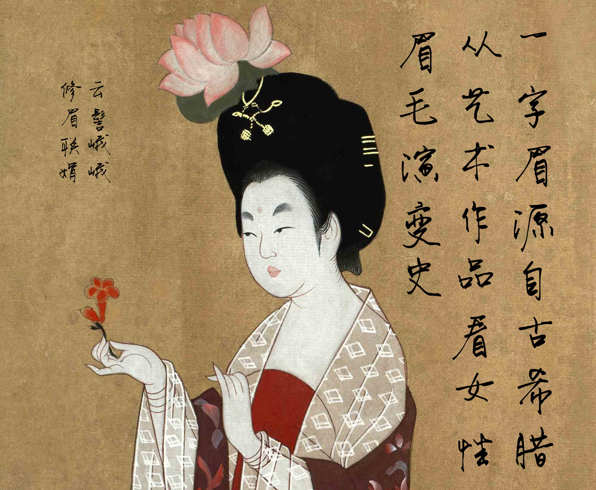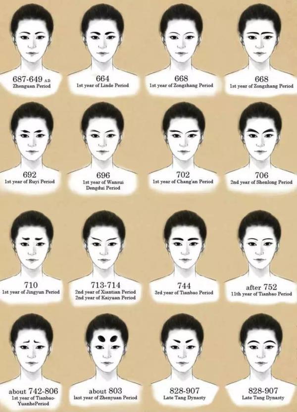 唐朝武则天统治时期鼓励女子画青黛眉,黛是一种有光泽的青黑色的颜料。当时流行的似乎是一种源于波斯的螺子黛,贵得让人望而却步。而在齐梁时代则流行另一种眉毛:蛾眉(也作娥眉),一种细长而弯的眉形,眉尾像蚕蛾细长的触须。当时还有诗云:"众女嫉余之蛾眉兮。"【译者注:The thronging ladies were jealous of my moth-like eyebrows,此句应为屈原《离骚》中的一句,但屈原为战国人(公元前340-278年),与文中所说的齐梁时代时间相差太大,应为作者笔误】。偶尔过个十来年,宫女们可能又慢慢厌倦了早起画蛾眉,重新流行起又短又粗的眉毛。
