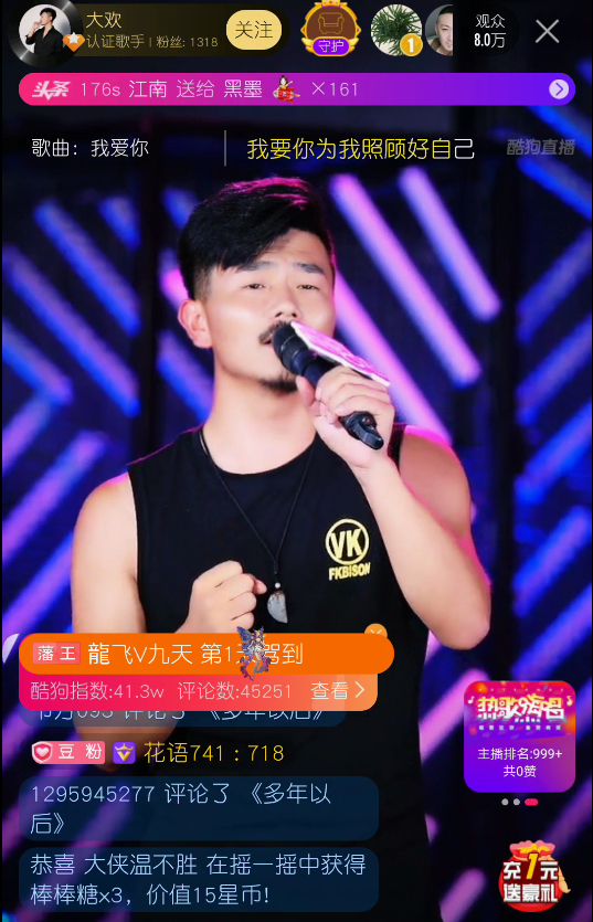 “欢迎大家来到我的直播间”19:30整,大欢一身休闲装亮相直播间后,便热情地跟等候已久的5万粉丝打招呼,接收到歌手上线信号的粉丝们,也纷纷用礼物传递自己的问候,刷得直播间满屏都是鲜花!受宠若惊的大欢用一口浓浓的东北话直言“这屏幕嗖嗖的,都是花,字都看不见了”,逗乐了不少观众。