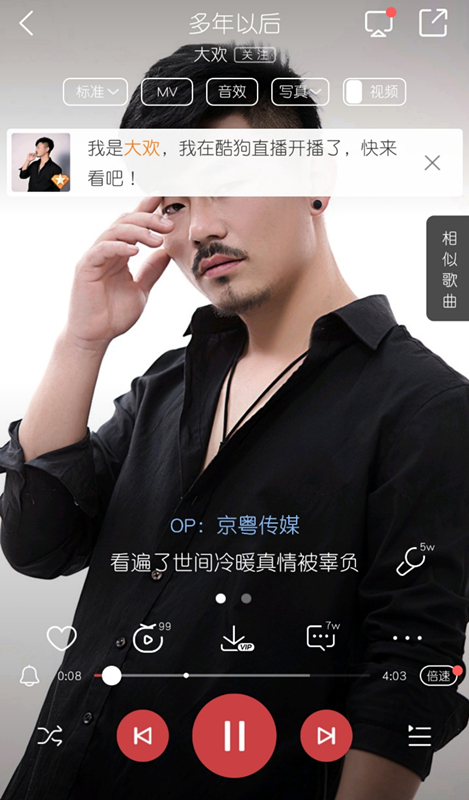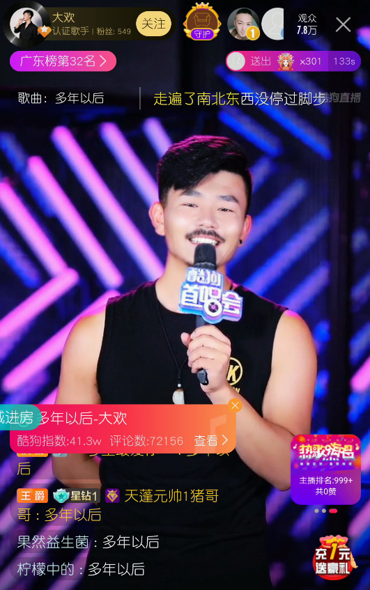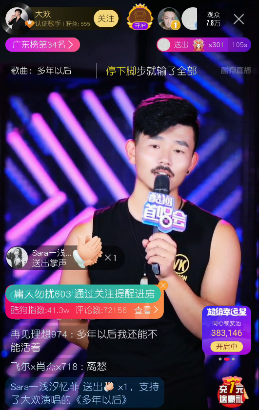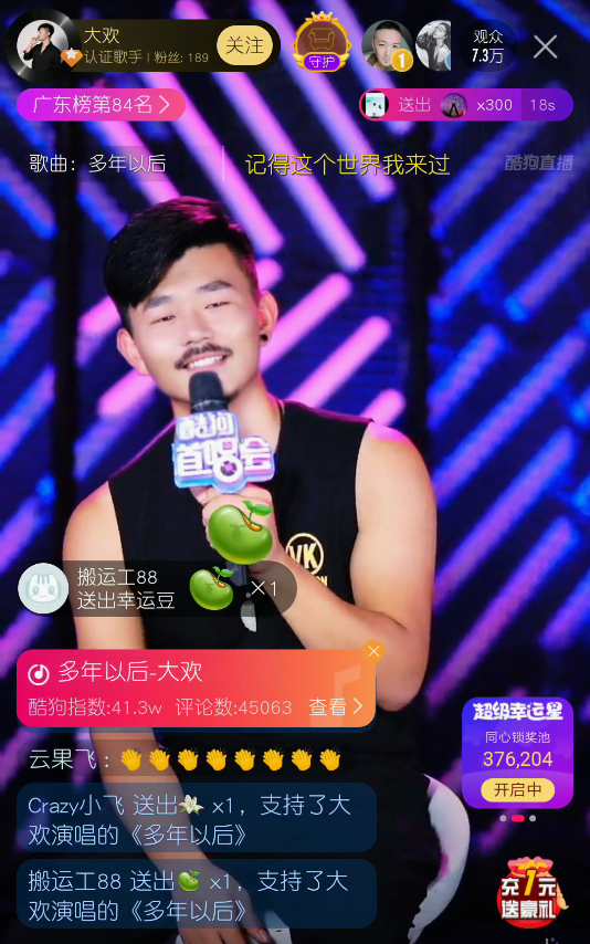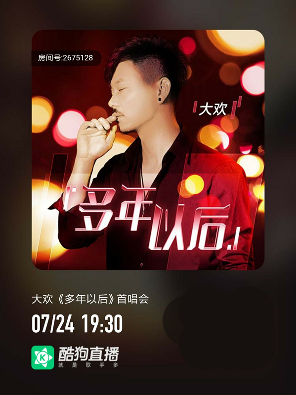 7月24日晚,草根歌手大欢携代表作《多年以后》做客酷狗首唱会,在直播间大展歌喉,用嘹亮动人的歌声与19万观众分享自己的生活感悟和成名之路,感人至深!