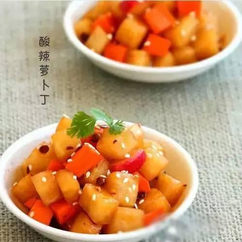 2、腌制萝卜丁的时候容器最好要干净无油,放入的盐适量不要太多,以免太咸,腌制出的水分要倒出来;
