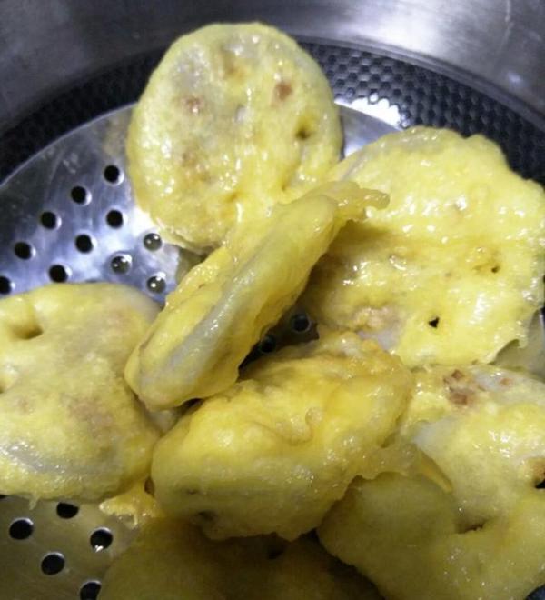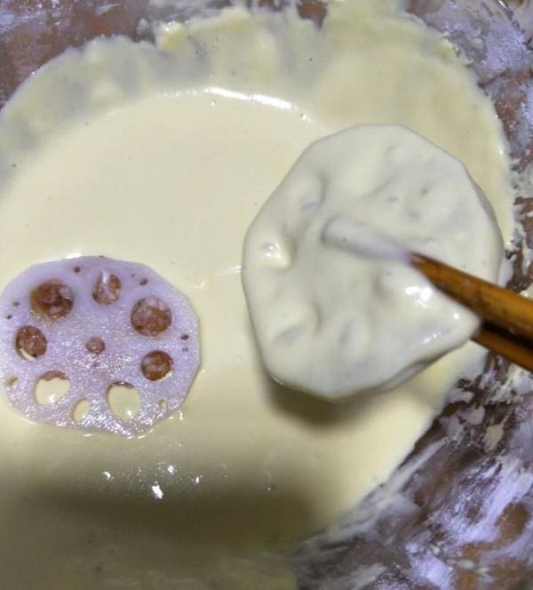 5、面粉加入鸡蛋打散然后加入盐和水一起搅拌成糊状,但是不要加过多的水否则莲藕会挂不上面糊,把全部藕片放入面糊中沾上面糊;