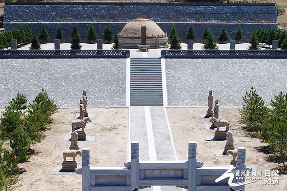 黄河新闻网吕梁讯 5月26日,山西吕梁市方山县,修复后的于成龙墓园庄严肃穆,墓冢背靠高山,绿树环抱,墓前有牌坊,两旁竖立着石人、石马、石羊等。