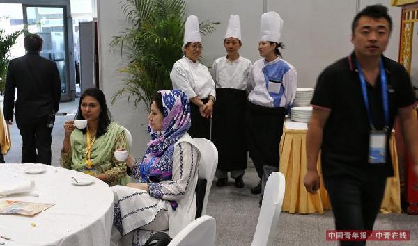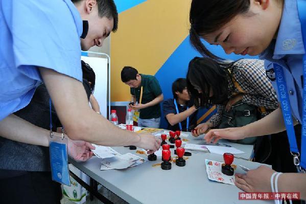 国际合作高峰论坛新闻中心,为期两天的高峰论坛接近尾声,一名参会者在背板前拍照留念。为了能及时发稿,许多记者带着电脑到餐厅吃午餐。参会者购买纪念邮品后,加盖纪念邮戳。来自台湾的媒体人在背板前合影留念。