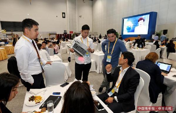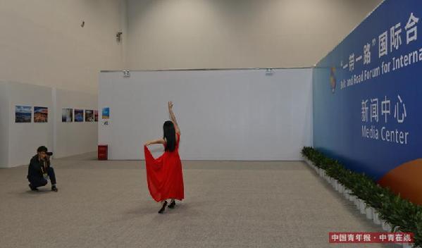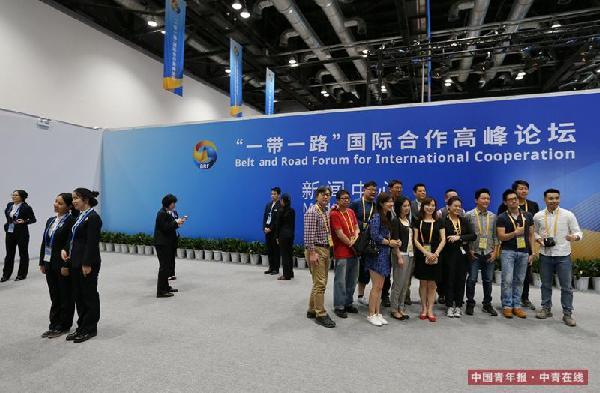 5月15日,"一带一路"国际合作高峰论坛新闻中心,为期两天的高峰论坛接近尾声,一名参会者在背板前拍照留念。中国青年报·中青在线记者李建泉/摄