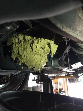 照片中,大量如呕吐物一样的黄色、绿色粘稠状物质溢满了发动机表面和底部。