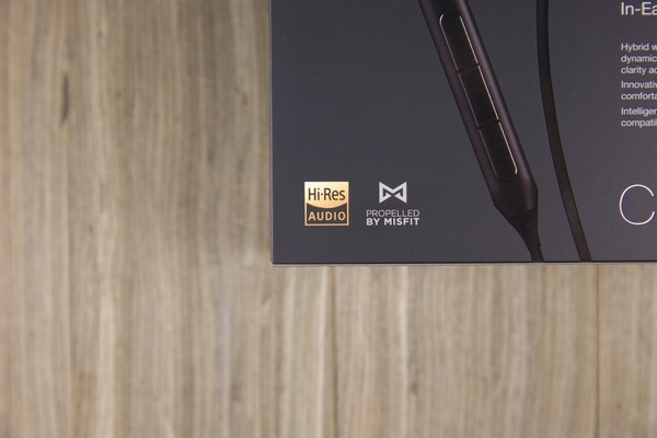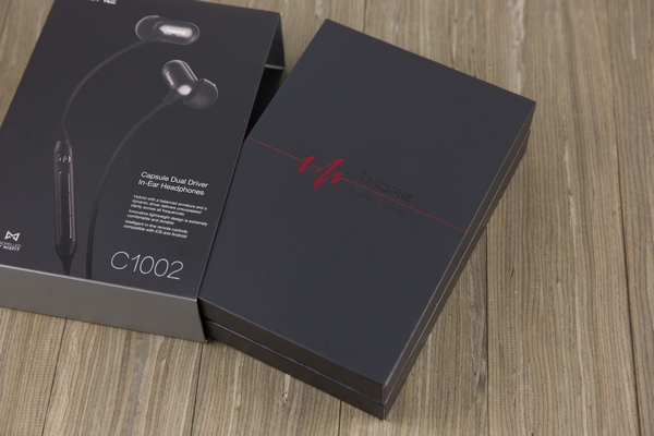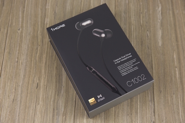 不免俗先来个开箱,C1002 的包装设计使用了比较沉稳大气的黑色调,盒子正面就是耳机的主体外观,突出了胶囊造型和可线控的特色。左下角还有 Hi-Res 小金标的认证,可以说是在音质上已经有了一定的保证。