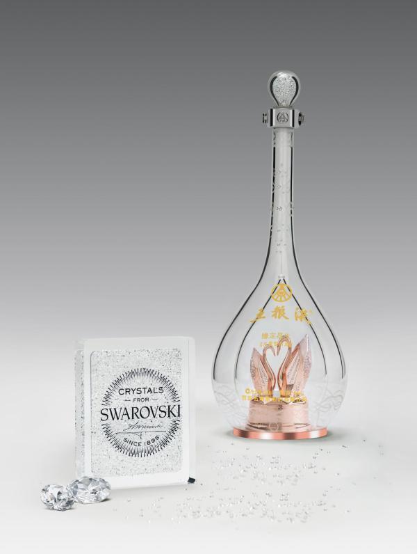 融合了施华洛世奇元素的五粮液"缘定晶生"酒,采用瓶中瓶设计,由两只施华洛世奇经典水晶天鹅构成爱心形状,酒瓶颈部由意大利工匠手工镶嵌施华洛世奇水晶,瓶盖镶嵌水晶沙,尽显时尚、高端。产品设计蕴含了对爱情的鉴证和美好祝愿,是行业首款专为高端、时尚婚庆定制的礼品酒。