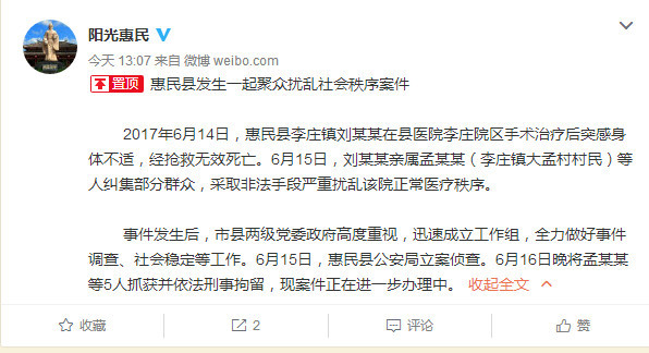 微博认证为"滨州市惠民县人民政府官方微博"的账号在17日下午13时发布信息称,当地发生了一起"聚众扰乱社会秩序案件",患者在惠民县医院李庄院区手术治疗后突感身体不适,经抢救无效死亡。6月15日,刘某某亲属孟某某(李庄镇大孟村村民)等人纠集部分群众,采取非法手段严重扰乱该院正常医疗秩序。6月15日,惠民县公安局立案侦查。6月16日晚将孟某某等5人抓获并依法刑事拘留,现案件正在进一步办理中。