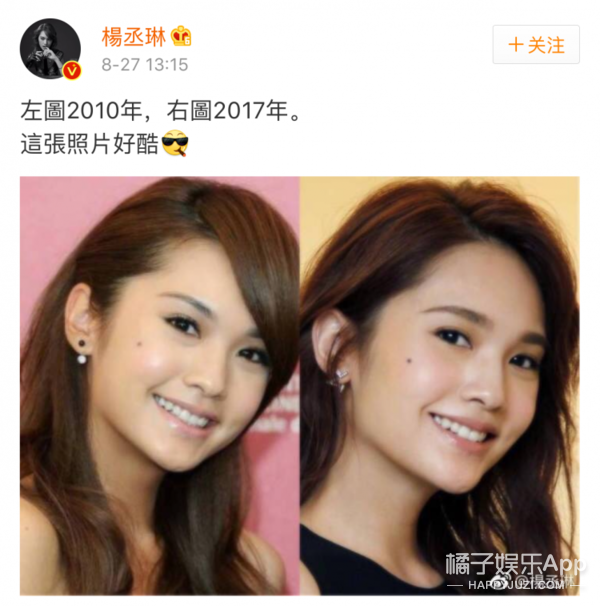 昨天,杨丞琳在微博晒出一张新旧对比照,左边是2010年的照片,右边是今年的照片,虽然两张照片隔了整整7年,但是杨丞琳的外貌几乎没变过,可是说是很冻龄了。
