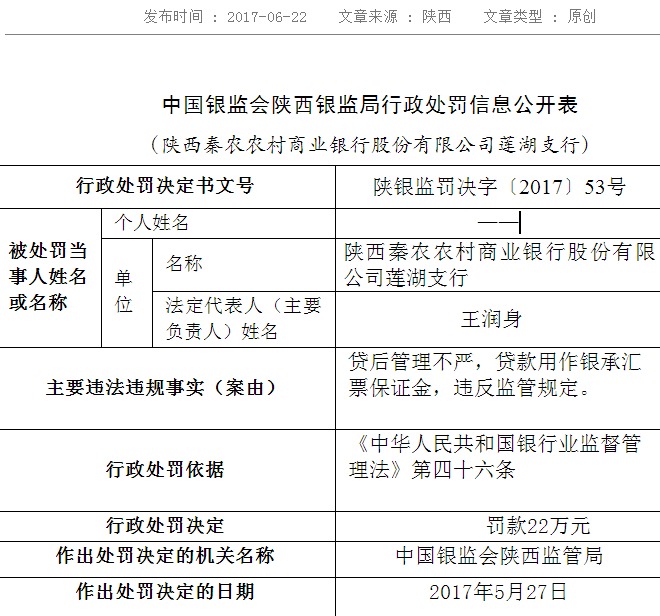 秦农农商银行莲湖支行被陕西银监局罚22万