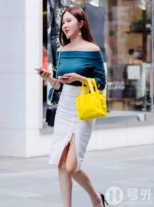 小姐姐身上搭配一件蓝色的修身一字肩上衣,不仅能够展示优雅的双肩,还能让身材凸显的更加有韵味。下半身选择搭配选择一条高腰的白色的包臀裙,紧身的版型结合开叉的设计让她穿搭在身上的时候更有女人味,脚上搭配着一双气质的尖头高跟鞋显高显瘦又有魅力。