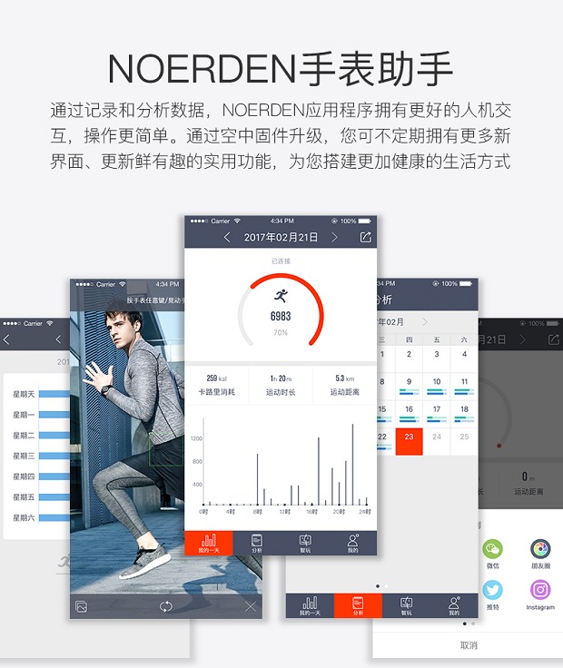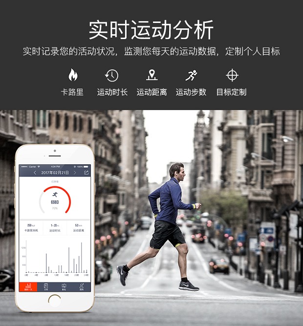 运动分析:实时记录你的活动状况,监测你每天的运动数据。可以看到运动步数、卡路里消耗、运动距离、运动时长等一系列数据综合每一天、每一周的运动情况进行统计,结合图表化的显示,看起来非常的直观。