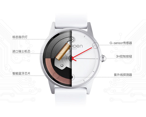 不同于大部分的智能手表设计,这款智能手表拥有超薄机身,告别厚重的电子屏幕,延续传统腕表圆形表盘和实体机械指针的设计,并配备瑞士原产的石英机械表芯。