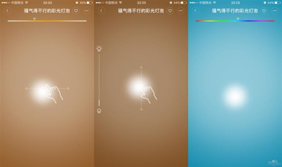 滑动调节的过程中手感太差,无法实现精准的调节。我在使用中经常发生"滑过头"的问题,特别是色温和色彩调节部分,滑块的滑动远比手指的滑动的距离长,而不同色温及色彩间的间隙又非常小,导致经常得左右微调才能选到合适的色温及色彩。