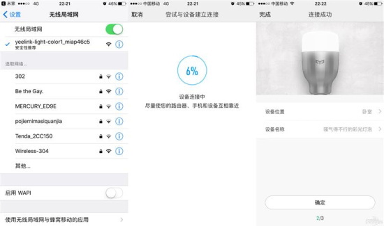 另外包装里面还有一张说明书,教你如何使用它。拧上灯泡,根据说明书的步骤操作,一两分钟就能完成灯泡和Wi-Fi的配对,实现调节颜色、亮度和远程操控等功能。