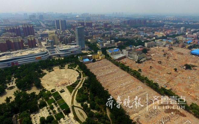 7月21日,记者航拍有"小泉城"之称的济南章丘区百脉泉景区,其周边还存在大面的城中村。其中章丘四中东片区(辛庄小区)1200余户、400余亩全部拆除完毕,数百米高空看,提升工程气势宏大。图为在紧邻百脉泉景观带的章丘四中东片区(辛庄小区)1200余户、400余亩全部拆迁完毕。
