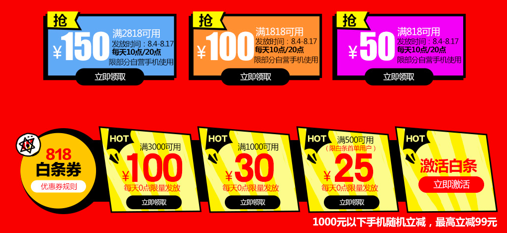 除以上劲爆优惠政策引领品牌日促销狂欢,更有亿万优惠券限时领取,满818减50,满1818减100,满2818减150,每天10点、20点两个时间段限量开抢,部分自营手机还可叠加使用。另外满3000减100、满1000减30白条券每日凌晨限量发放,白条首单用户还有满500减25优惠政策可享,更有1000元以下手机随机立减99元,买手机用白条,新机提前购还能下单立减,如此优惠力度,绝对不容错过!