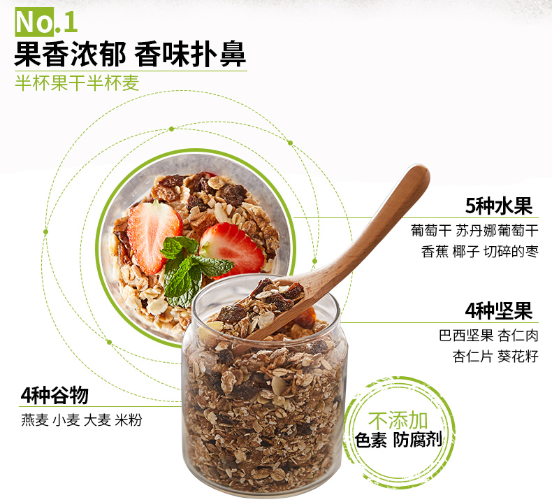 以烘烤过的麦片,苏丹娜葡萄干,燕麦片,大麦片,切碎的枣,葡萄干,葵花籽,杏仁片,香蕉片,巴西坚果片,烘烤过的椰子,杏仁干组成,香脆可即食,也可搭配牛奶等,营养丰富,饱腹感强。