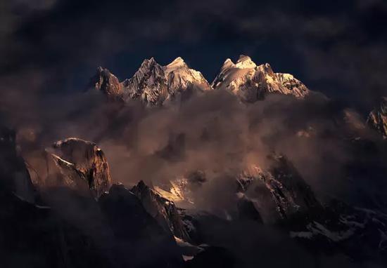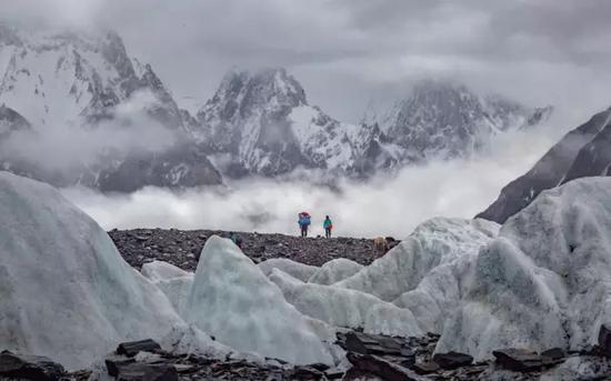 再比如下面这张200mm镜头拍摄的远景,冰川、碎石和人物、云雾以及雪山的纵深,也是通过遮挡(以及后面会讲的空气感),来进行表达的。