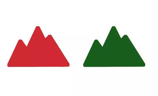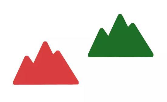 假设下面这张简化示例图,是我拍摄的一张照片。如果我告诉你右边绿色的山峰,实际在更远的地方,你很可能会觉得莫名其妙。这就是一张典型的缺乏层次感的照片,如果我们不在前期构图时采取一些措施,就很可能拍出这种很平的照片。