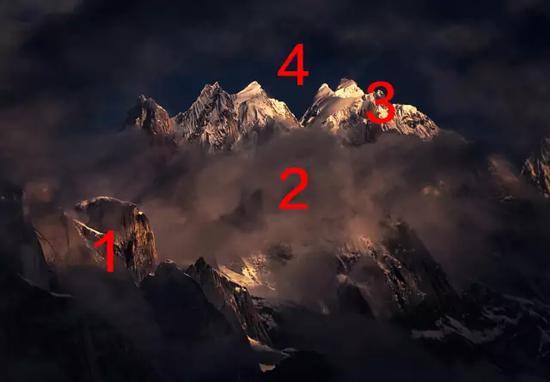 上面这张长焦雪山照片,就是非常典型的通过"层层遮挡"来表达空间关系的例子。1标识的岩石,挡住了2处的云雾,云雾又遮住了3处的雪山,雪山又把背后蓝天遮挡。岩石、云雾、雪山、蓝天,通过层层递进、互相遮挡的方法,前后关系非常清晰。
