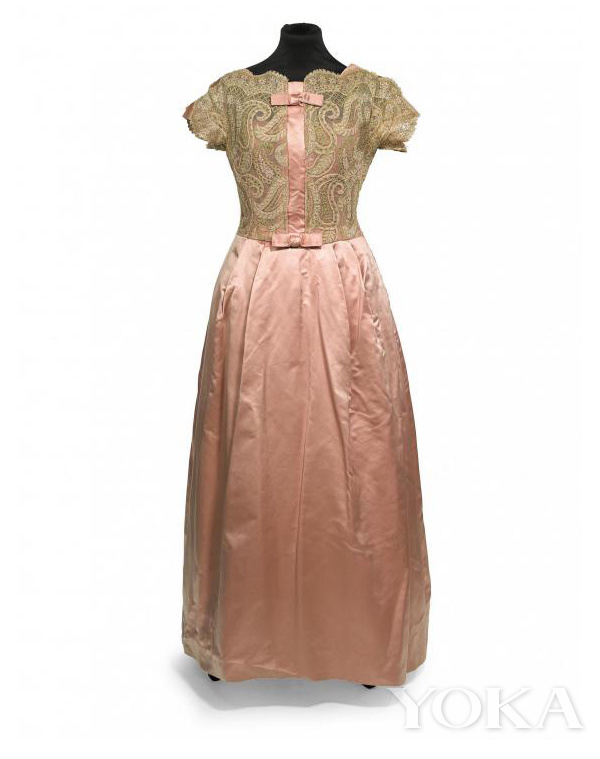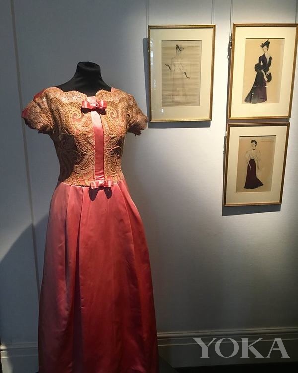 除了珠宝,还有一件粉红色蕾丝晚礼服,来自英国著名设计师Victor Stiebel,二战后他设计的那些外套、连衣裙、衬衫被称为"实用的时尚",简洁优雅又不失甜美。