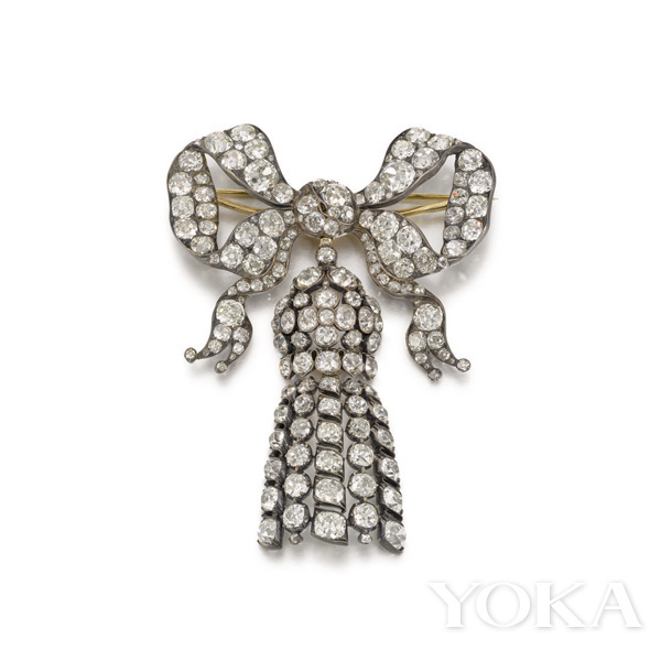其二就是这枚19世纪中叶的钻石蝴蝶结造型胸针,带有动感的蝴蝶结浪漫甜美,就和费雯·丽所饰演的郝思嘉的性格如出一辙。