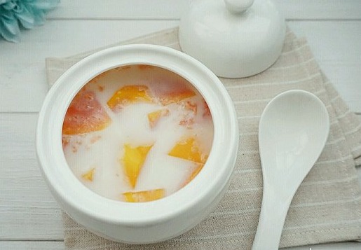 (4)将木瓜汁倒入碗里,然后再倒进80ml热牛奶,搅拌均匀,放置凉却凝固即可开吃。