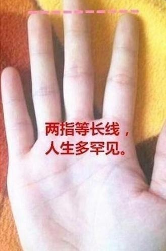 4:食指和无名指一样长,这类手很少见,拥有此手相的人在年轻能吃苦,日子苦难,30岁之后事业发黄腾飞,当个小板能挣下千万家业还是很稳的