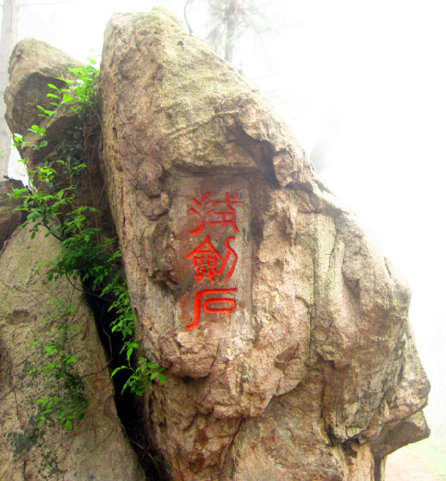 铸剑池北有两巨石相合,如双掌合一,十指向空,称“合掌石”,又称“试剑石”,相传欧冶子当年铸成宝剑,为试剑锋,对此石用力一劈,剑过石开。试剑石旁有“莲花石”,形似盛开的莲花,山风吹过,似有阵阵清香。神工鬼斧,令人叹止。