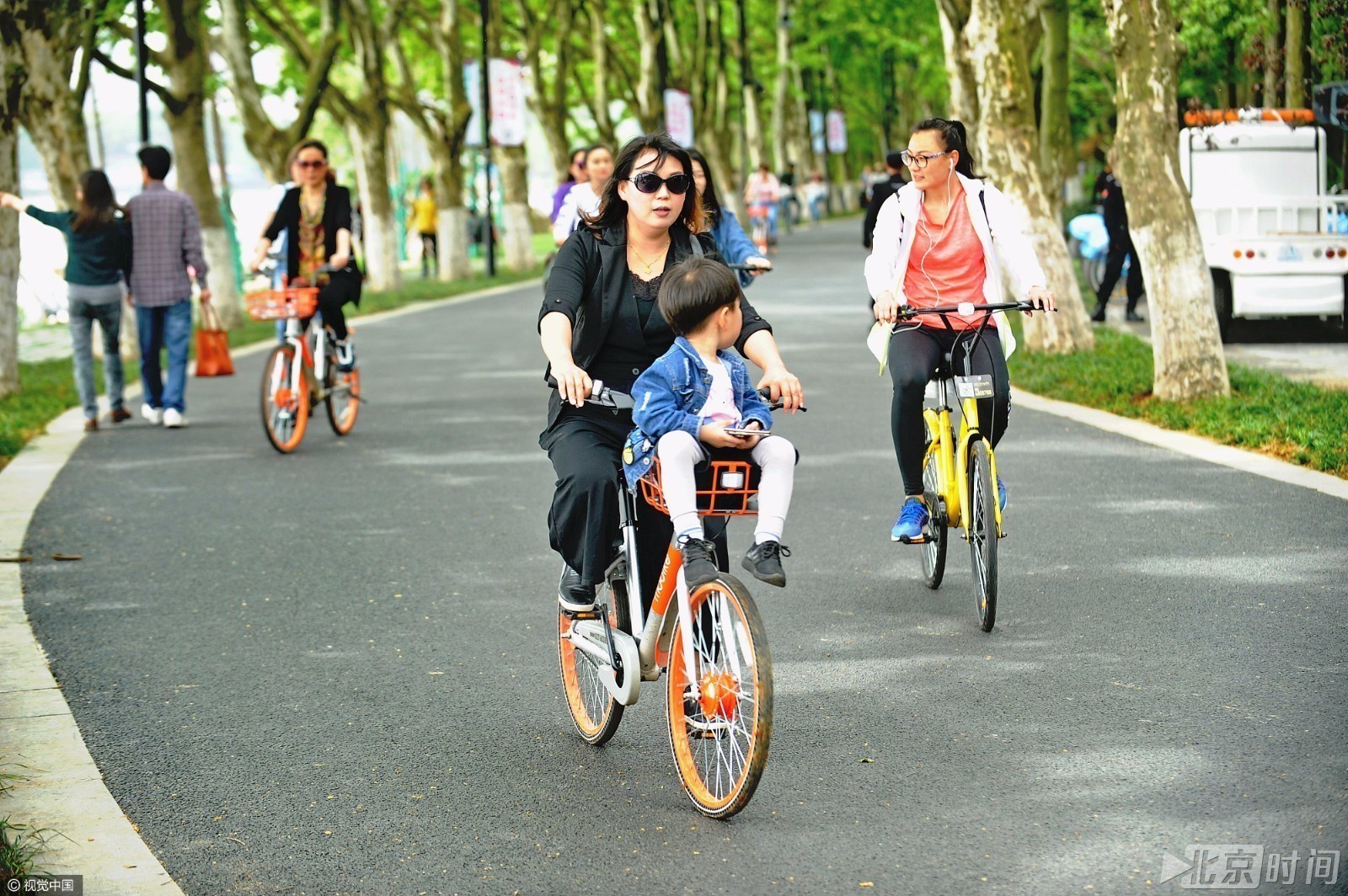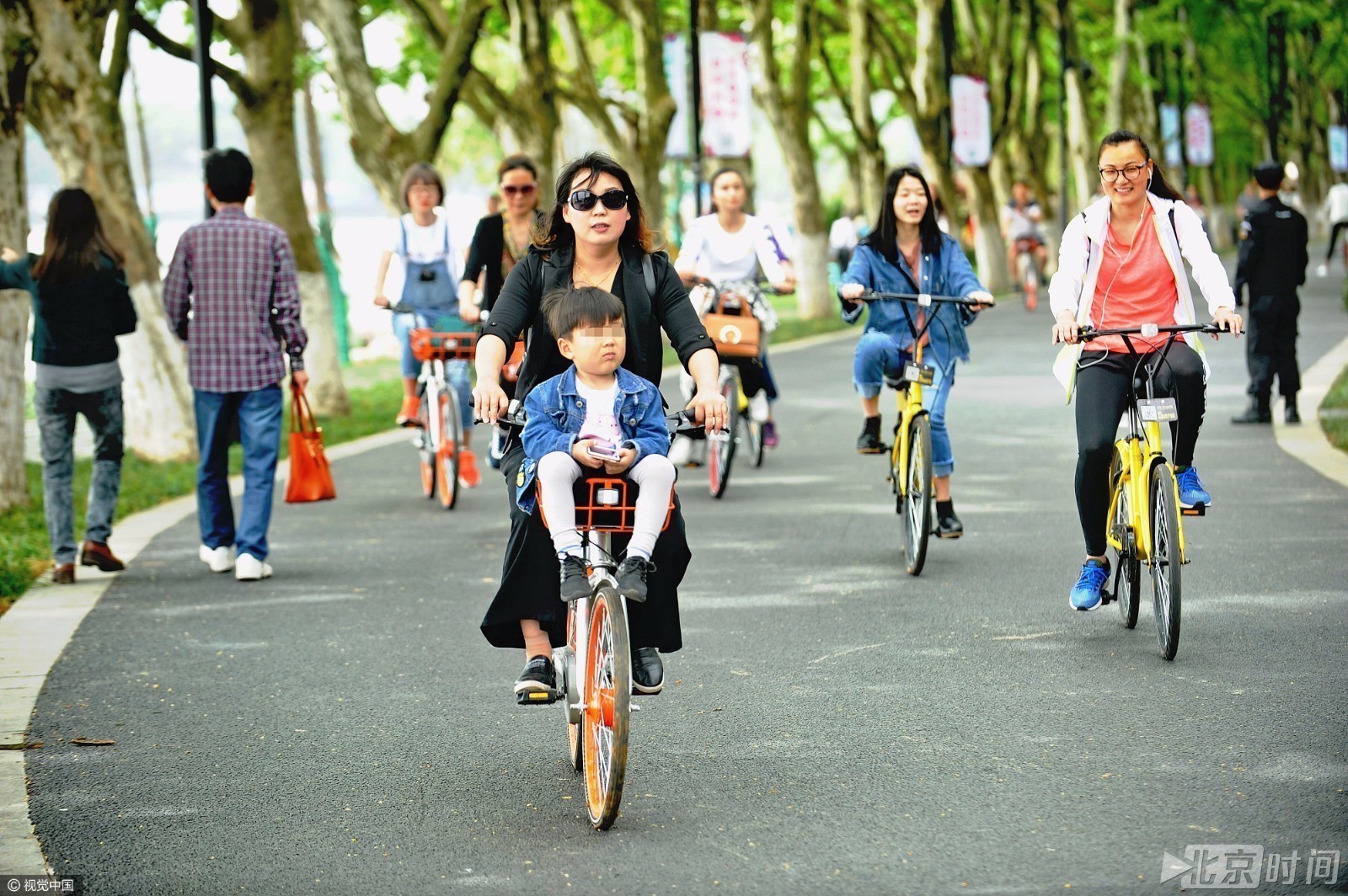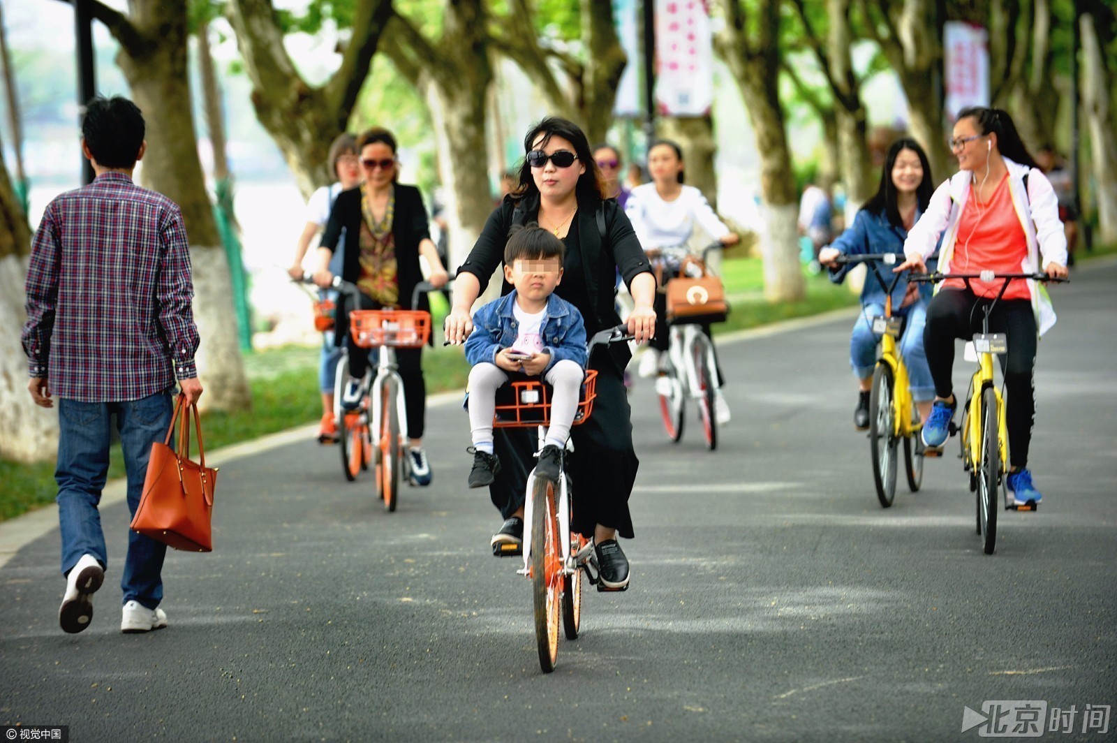 武汉东湖绿道上,一名骑行共享单车的女士,车篓里坐着正在玩手机的小孩。