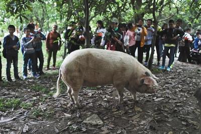 4月25日,建川博物馆,“猪坚强”每次在外面散步都会引起游客的围观。