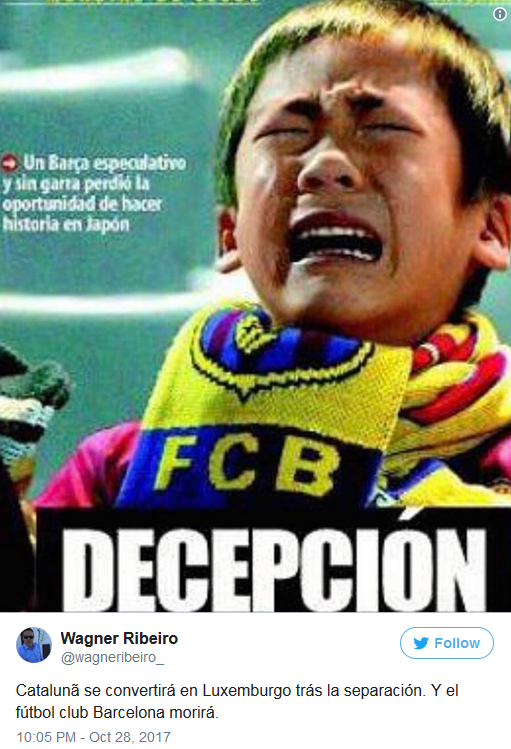 内马尔的前经纪人里贝罗看到加泰罗尼亚的政治形势后表示,这样下去巴萨也不会有好结果。