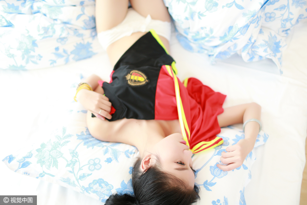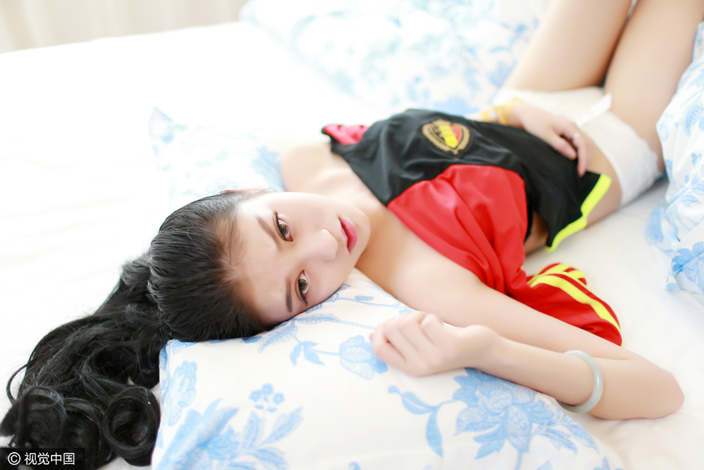 2016年06月17日,2016欧洲杯,比利时足球宝贝身披比利时球衣拍摄写真,球衣包裹纤柔玉体显性感撩人,比利时队首战负意大利队,美女宝贝助威比利时队能够接下来的小组赛顺利取胜成功突围。