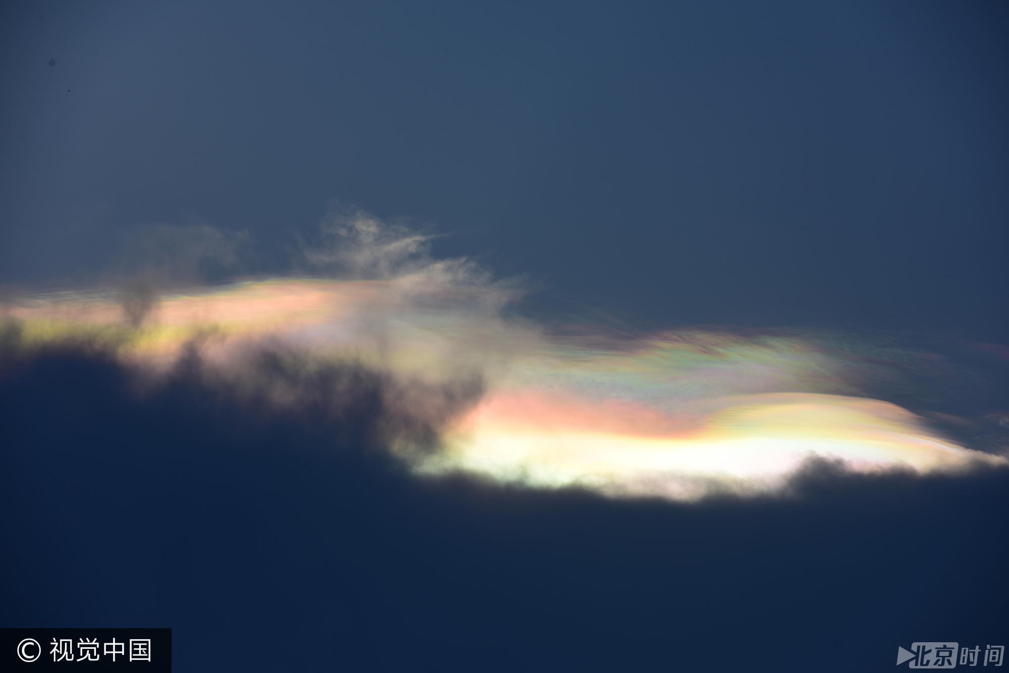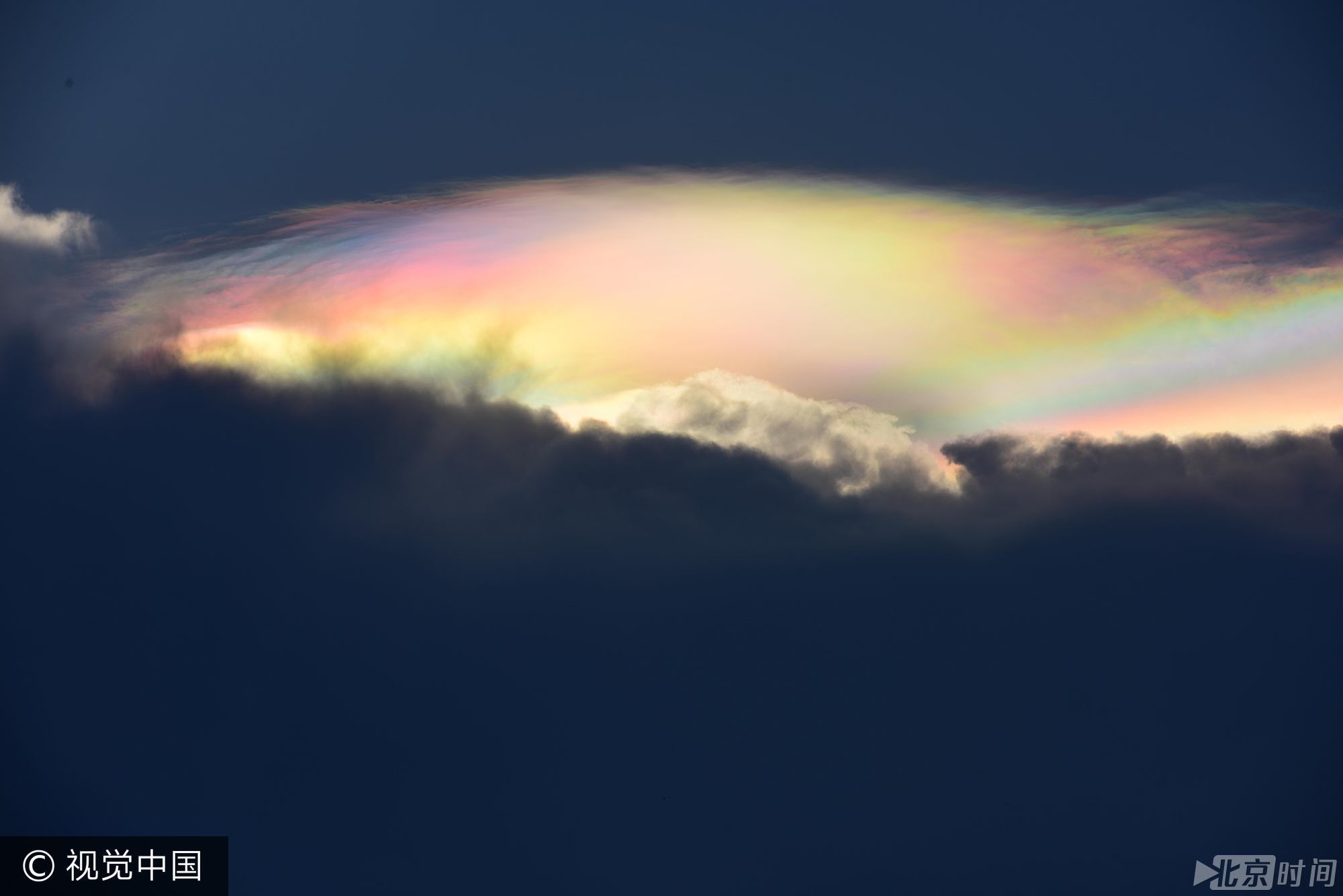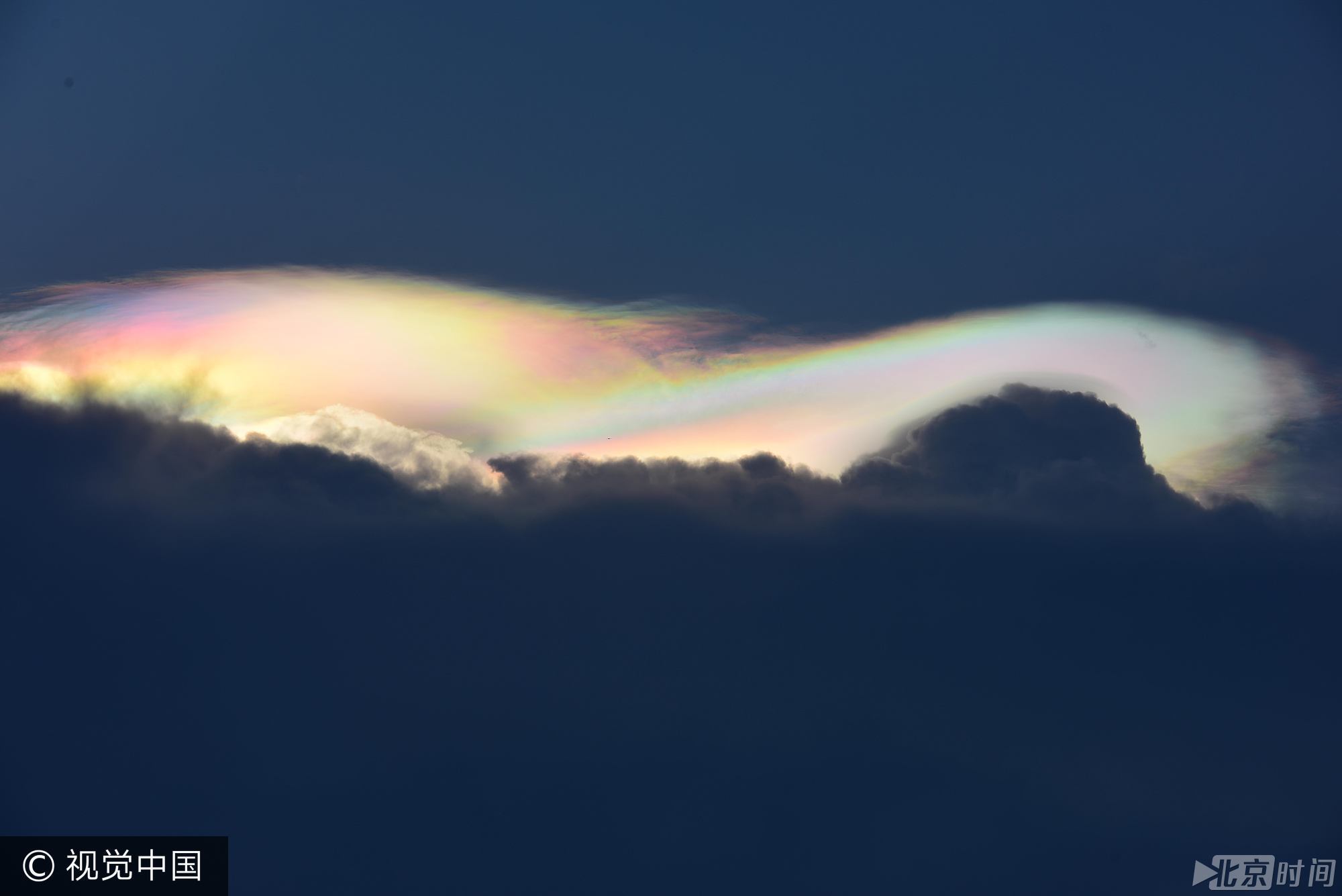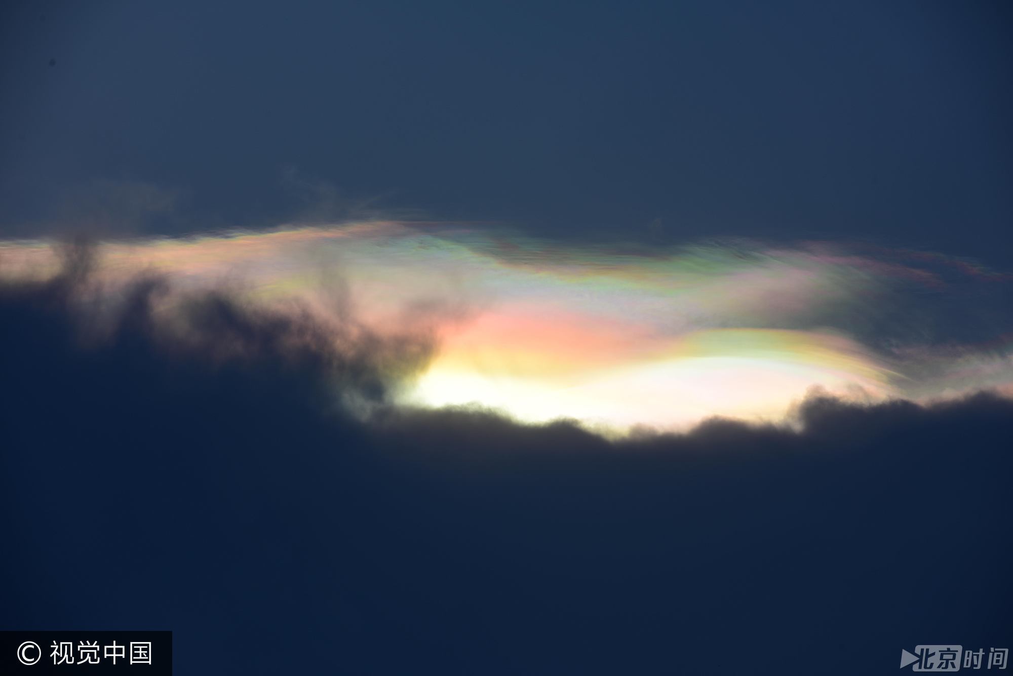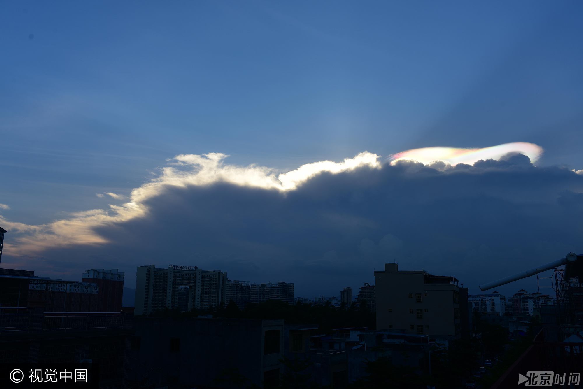 海南琼海,高温下的上空出现五彩缤纷的彩云。随着太阳渐渐落山,云彩变幻着各种颜色,似火把,如烈焰。近日,海南部分地区持续出现摄氏35度以上的高温天气。