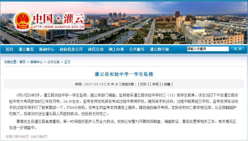 3月17日15时许,灌云县实验中学一学生坠楼,据公安部门调查,坠楼者系灌云县实验中学初三 班学生殷某。