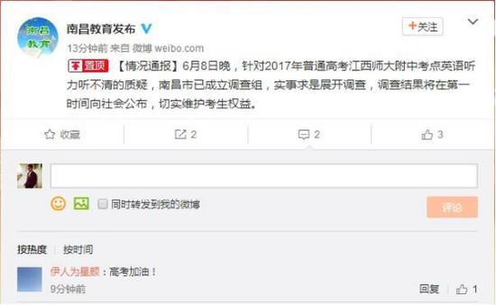 南昌市教育局官方微博回应称:南昌市已成立调查组,实事求是展开调查,调查结果将在第一时间向社会公布,切实维护考生权益。