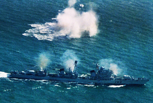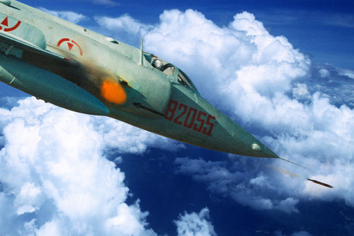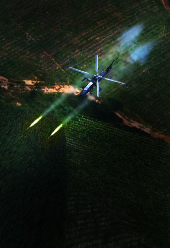 乘另一架战机在直19飞机上方300米,垂直角度航摄火箭弹实弹攻击。